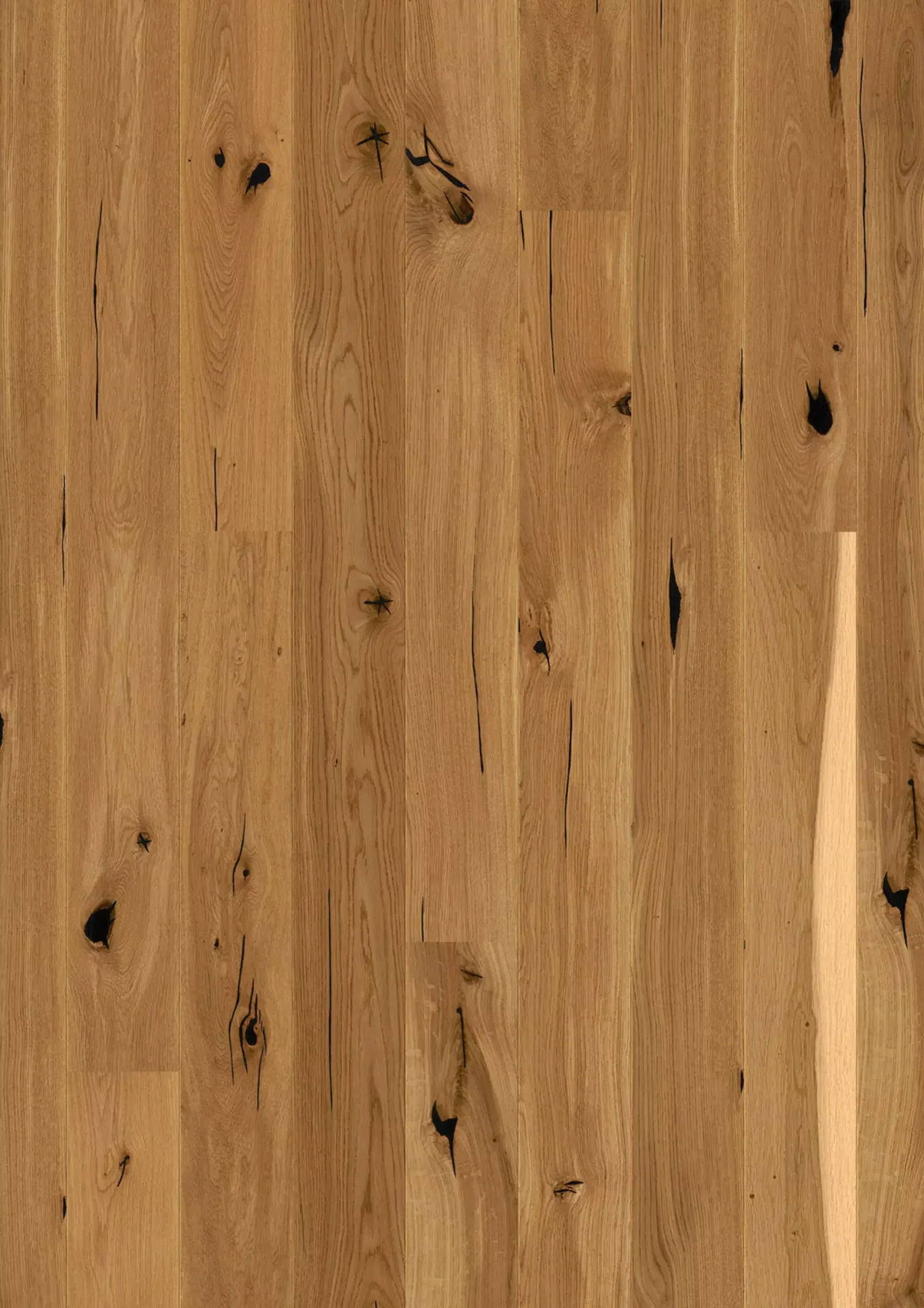 In der Country-Sortierung darf die Eiche zeigen, was sie über Jahrzehnte im Wald geprägt hat: Deutliche Astanteile, natürliche Risse (fachgerecht dunkel ausgespachtelt) und ein kräftiges, lebendiges Farbspiel stehen hier im Mittelpunkt. Jede Diele ist ein Unikat. Die schmale Form der EDITION-Diele sorgt dafür, dass dieses rustikale Bild nicht überladen wirkt, sondern den Raum rhythmisch gliedert und ihm eine unverwechselbare Persönlichkeit verleiht.